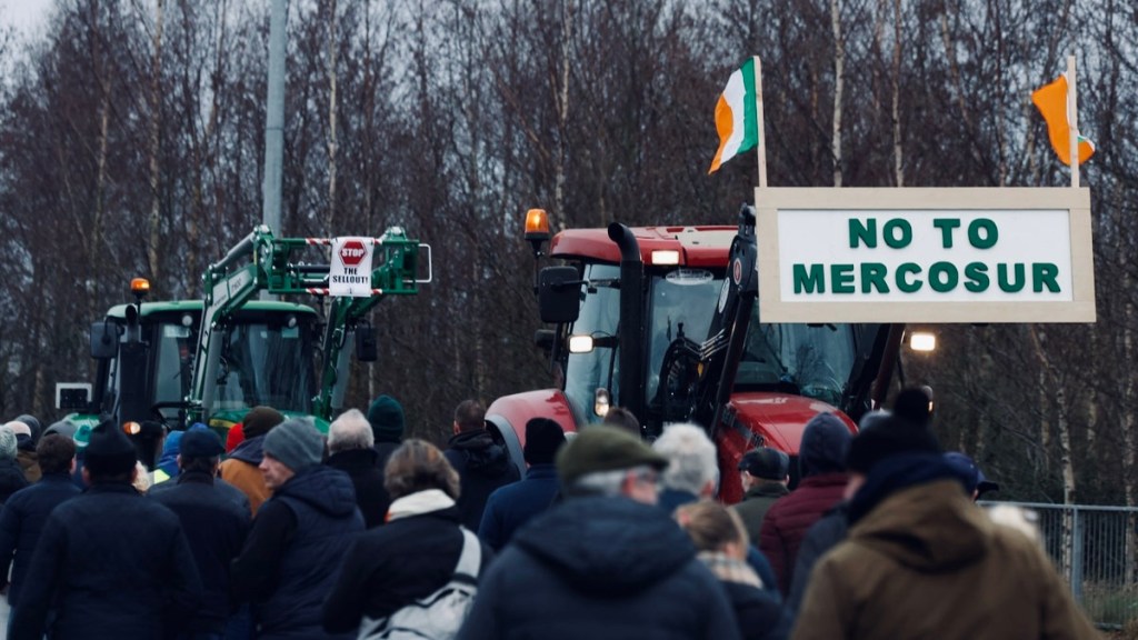 Tractors gathered in Athlone, central Ireland, with demonstrators displaying banners reading “Stop EU-Mercosur” and accusing the EU of betraying rural communities.